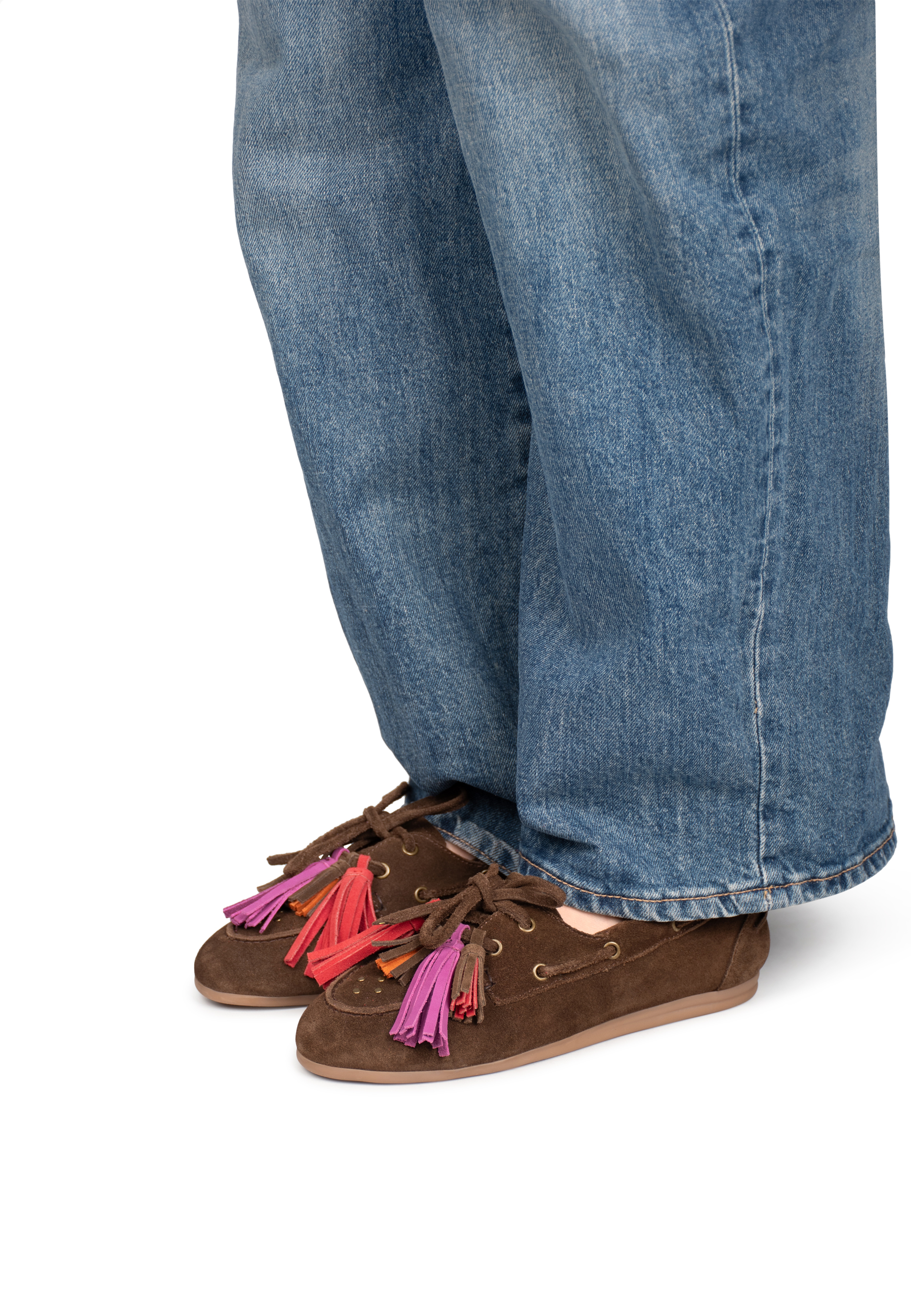 Zijaanzicht van camel suède loafers met kwastjes en platte zool